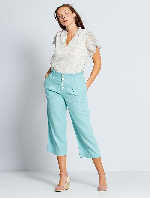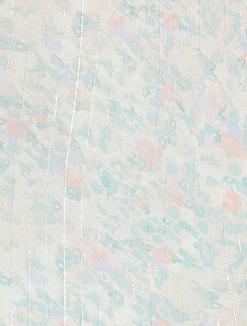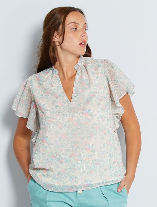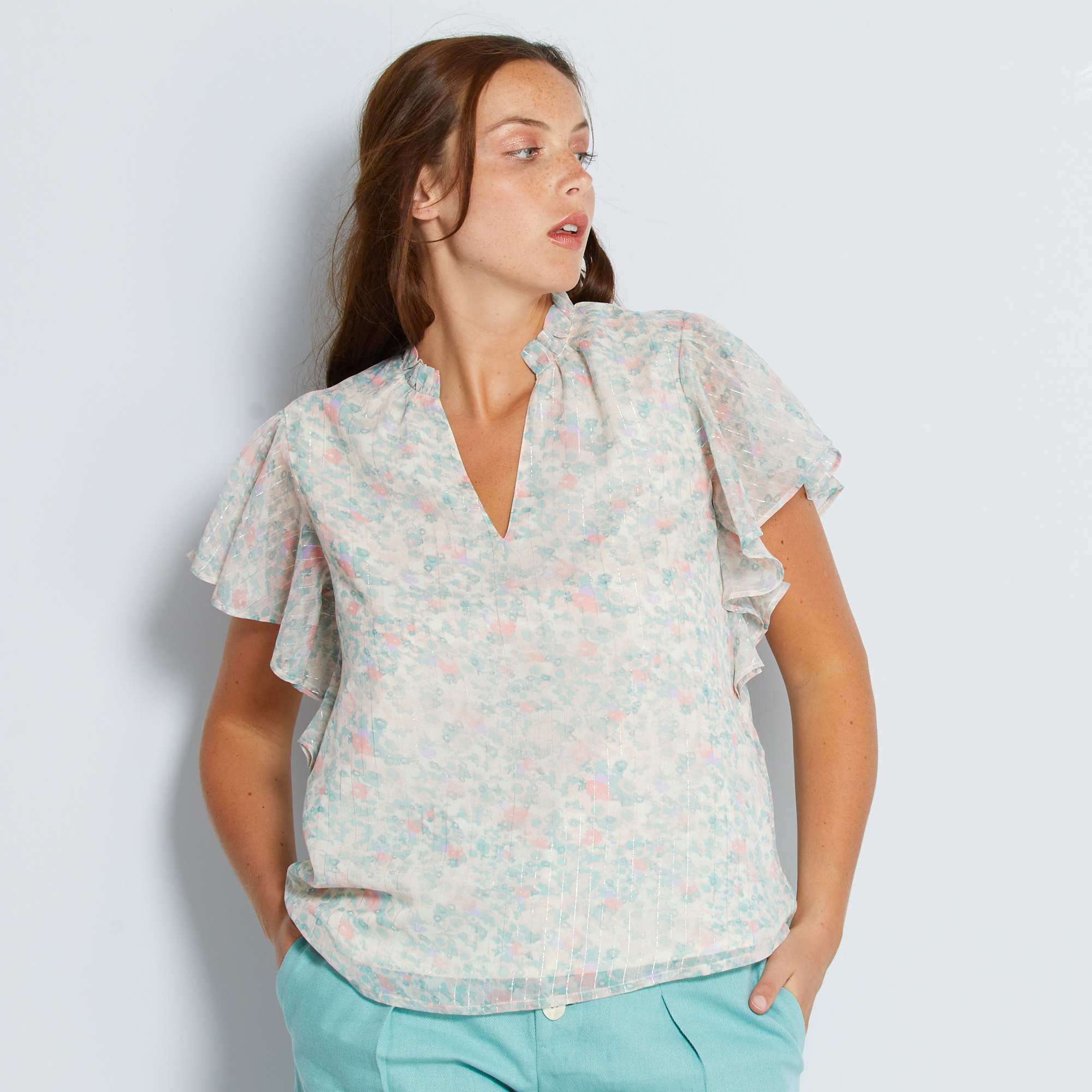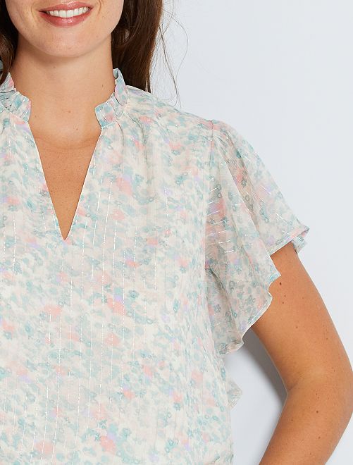 Adoramos o estampado pastel, as mangas com folhos grandes e os fios metalizados desta blusa que apostam na luz.