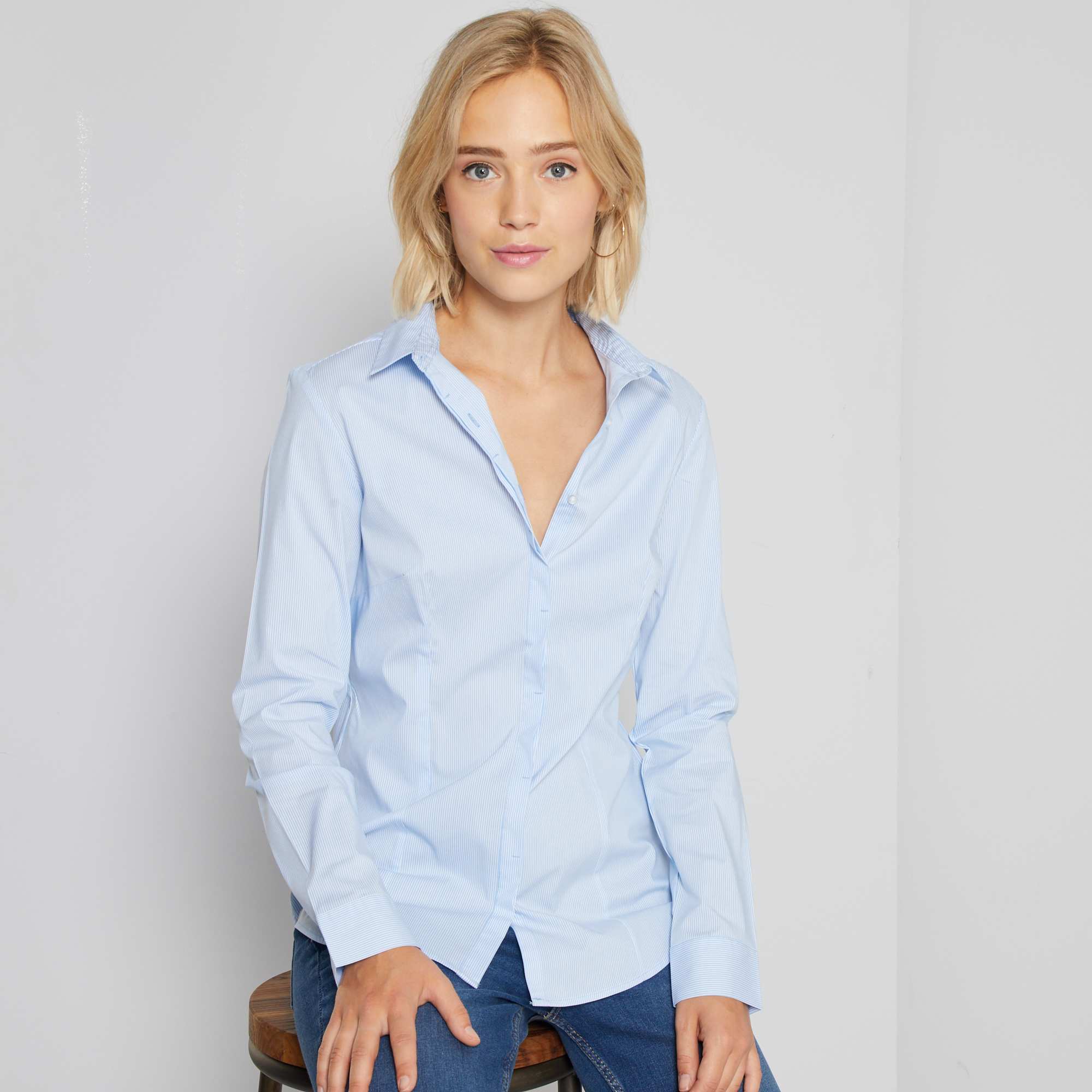 O básico da working girl! - Camisa cintada - Popelina elástica - Manga comprida na base com botões - Gola com pontas livres - Abertura com botões dissimulada em carcela - Base arredondada - Comprimento atrás: 68 cm. A nossa modelo veste um tamanho 38 e mede 1,77 m.