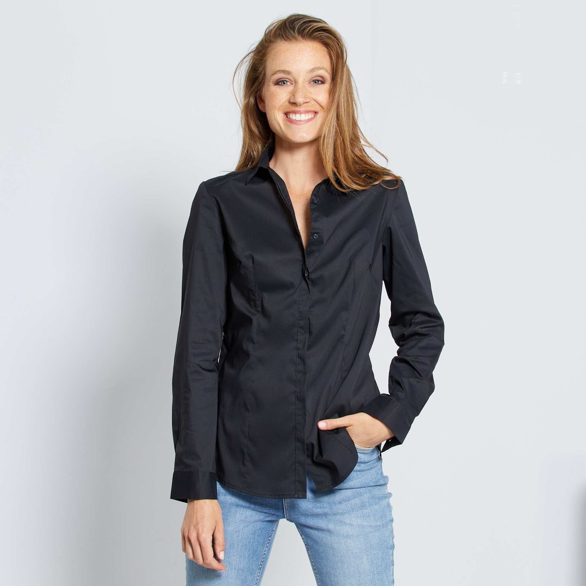 O básico da working girl! - Camisa cintada - Popelina elástica - Manga comprida na base com botões - Gola com pontas livres - Abertura com botões dissimulada em carcela - Base arredondada - Comprimento atrás: 68 cm. A nossa modelo veste um tamanho 38 e mede 1,77 m.