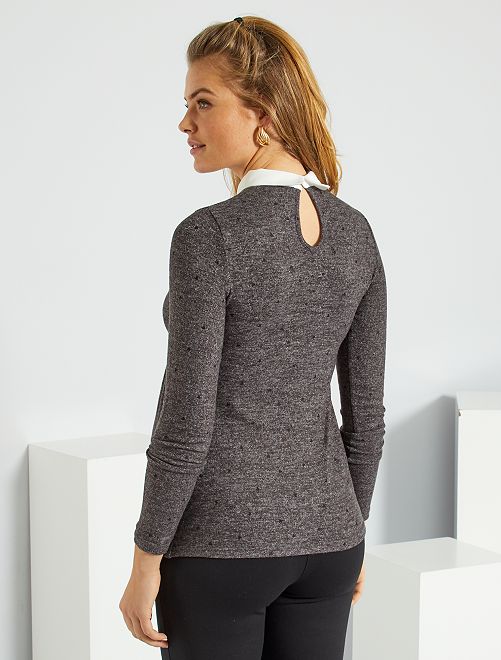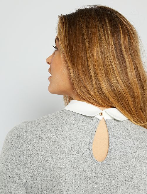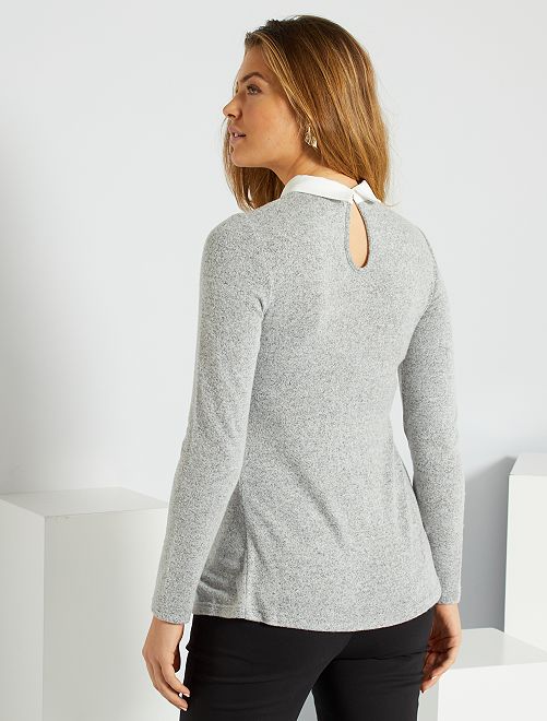 Uma camisola em malha muito suave, ideal para envolver a sua gravidez em suavidade e feminilidade. O seu colarinho branco dá um toque chique e atual.