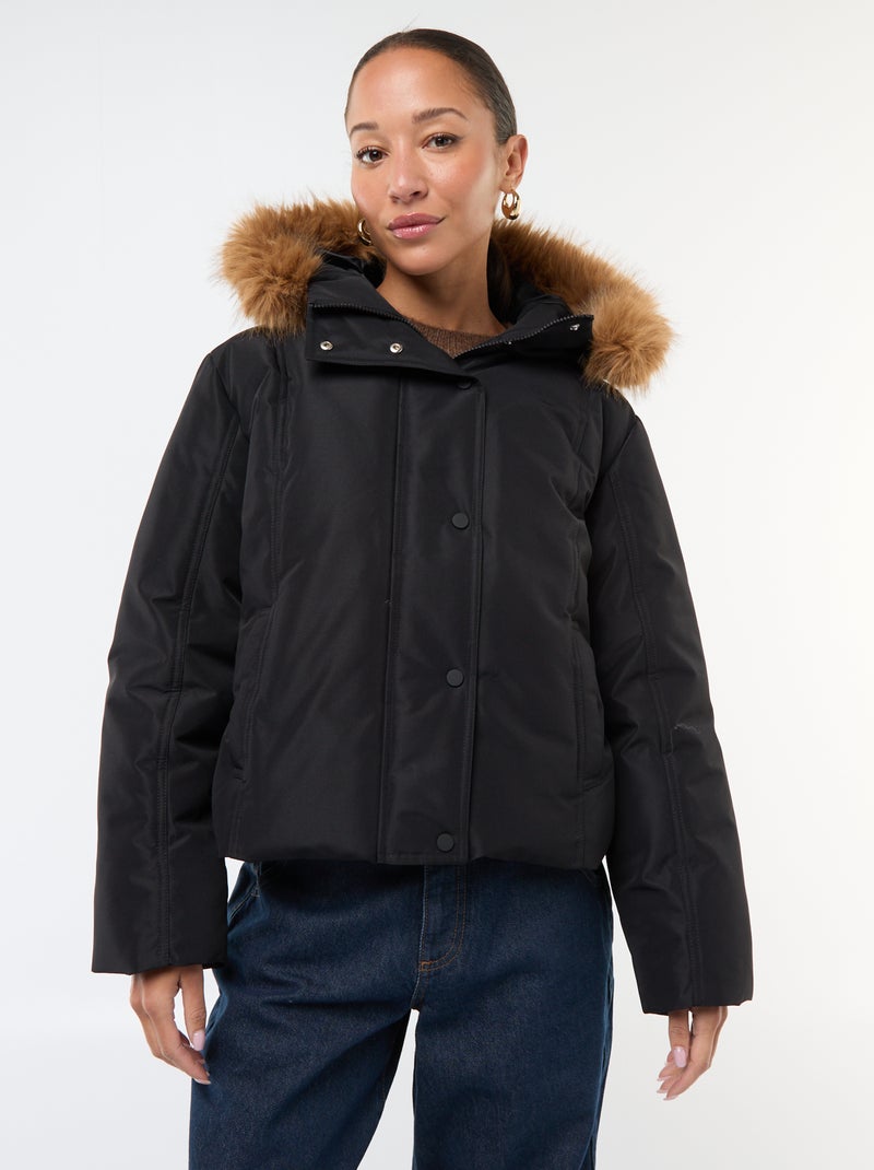 Casaco almofadado curto com capuz e efeito pele 'JDY' - Preto