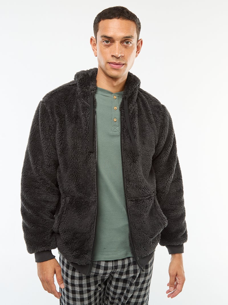 Casaco com capuz e fecho de correr em malha pelúcia - Preto