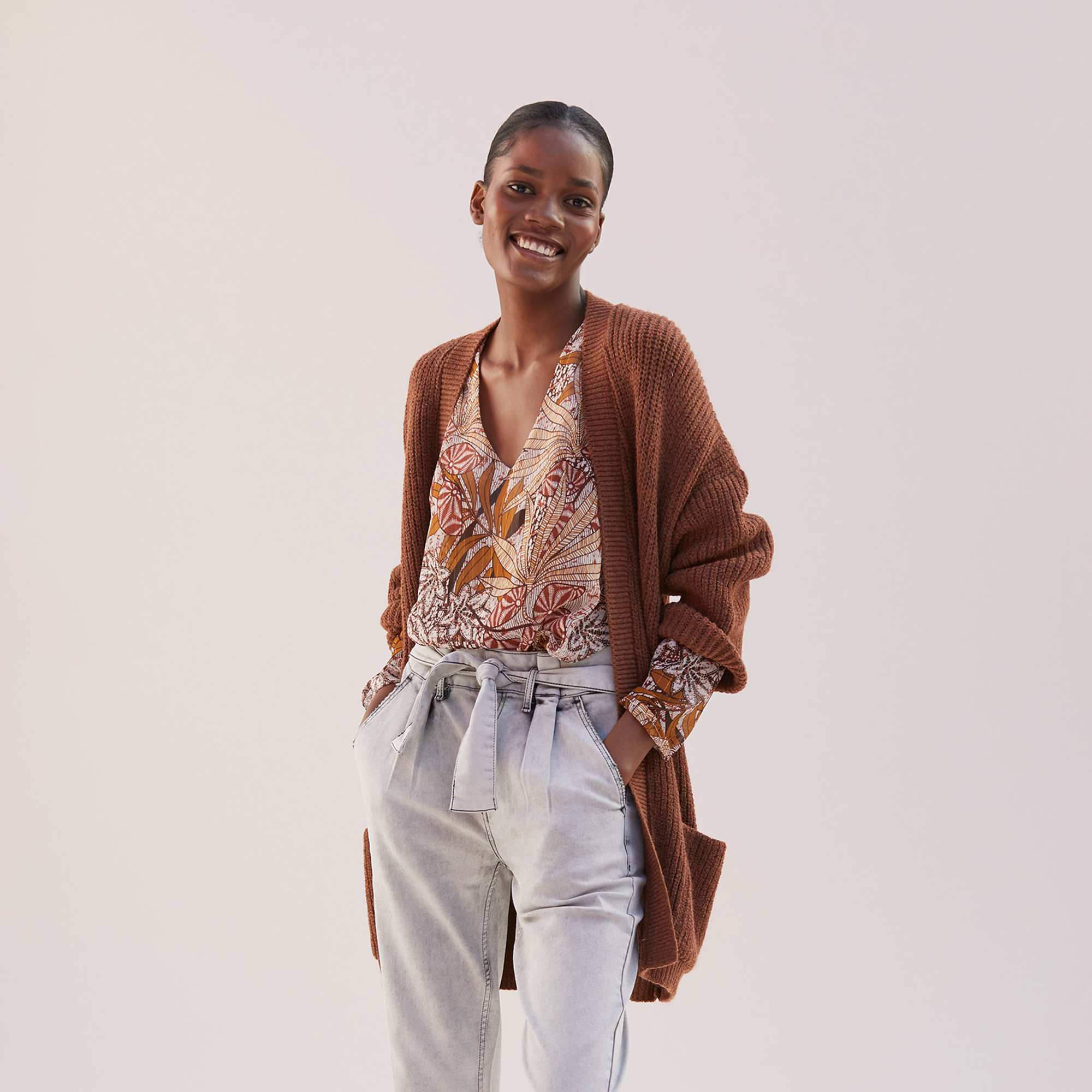 - A nossa modelo veste um tamanho M e mede 1,74 m