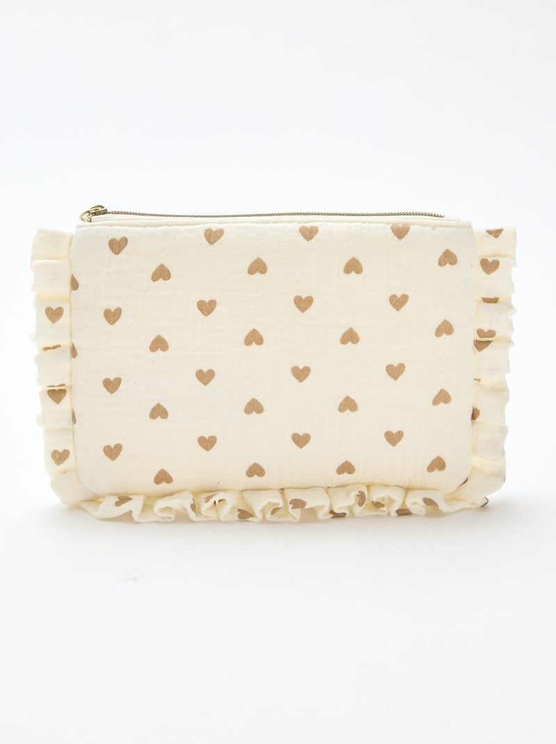 O necessaire de toilette que reúne todos os encantos: material em gaze de algodão, motivo de corações, bordas com efeito franzido.