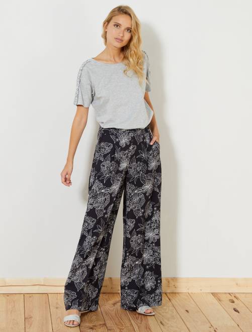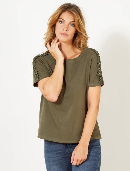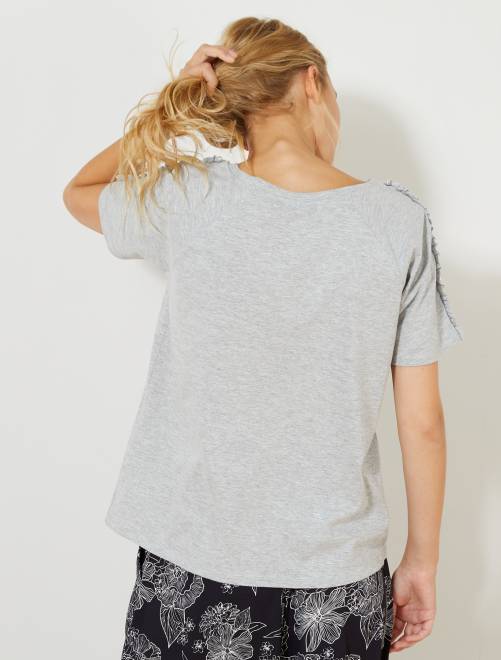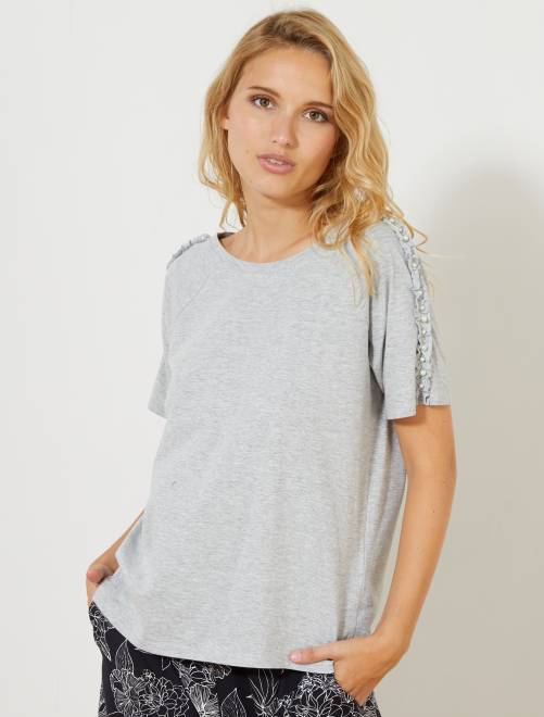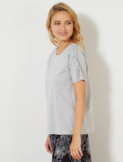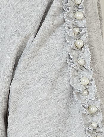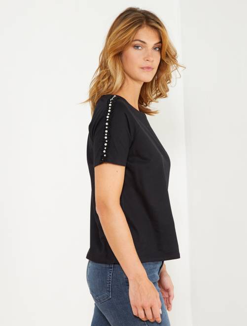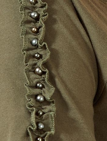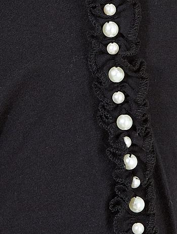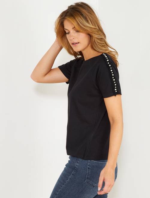 T-shirt com folhos e pérolas